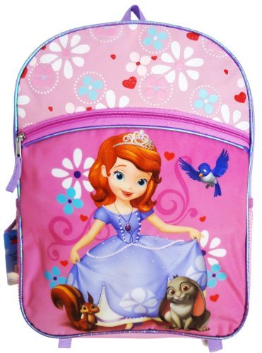 Disney Sofia 16" Backpack. Features a front compartment, 2 side mesh pockets, and a large main compartment.