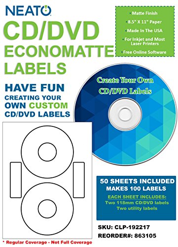 HIGH QUALITY LABELS: The Neato CD/DVD Economatte Labels include all the supplies you need to make your own custom disk labels. They feature a matte finish, perfect for inkjet and most laser printers, so your custom discs can have professional quality labels.