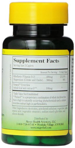 Research studies show that almost half of all migraine sufferers have low blood levels of Magnesium, which is critical in controlling vasospasms (the contraction and dilation of blood vessels in the brain which occurs during migraines). Migraine sufferers also suffer mitochondrial energy deficiencies, which Riboflavin (Vitamin B2) can improve when given in high dosages. The plant material Feverfew has been shown to reduce platelet aggregation, which can lead to vasoconstriction. All 3 ingredients have been recommended for years by many doctors and top headache specialists based on the clinical studies behind them. MigreLief combines all three of these ingredients into one formula, at the dosages the clinical studies show are beneficial. So, with MigreLief, you need only one product (instead of three separate products), and you take only two tablets per day, versus 4 to 10 tablets per day if taken separately. Plus, MigreLief’s Puracol Feverfew contains high levels of parthenolides and other active components, which other feverfew products can not guarantee Two tablets provide: Puracol Feverfew(Tanacetum parthenium) – 100 mg. Magnesium (Citrate/Oxide 1:1) – 360mg, which is 90% of U.S. RDA* Riboflavin (Vitamin B2) – 400 mg, which is 23,525% of U.S. RDA* *Percentage of U.S. recommended daily allowanceFeature
