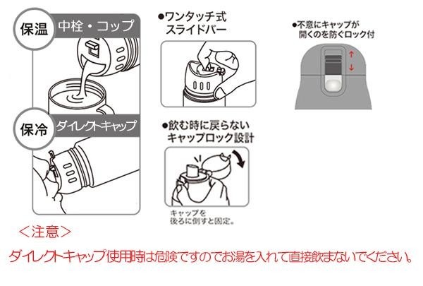 | 仕様 | 【容量】 ダイレクトキャップ使用時:470ml 中栓・コップ使用時:430ml 【保冷効力】 ダイレクトキャップ使用時:8度以下(6時間) 中栓・コップ使用時:8度以下(6時間) 【保温効力】 ダイレクトキャップ使用時:45度以上(24時間) 中栓・コップ使用時:73度以上(6時間) ●電子レンジ:使用不可 ●食洗機・乾燥機:使用不可 |