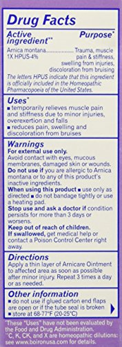 Studio : Boiron Publisher : Boiron Binding : Health and Beauty Product Description Arnicare Ointment 1 oz Ointment Arnica montana (or Mountain daisy) has been used for centuries as a natural pain reliever, and today, its one of the most popular homeopathic medicines in the world. Arnica is trusted by professional athletes to soothe sore muscles, by prominent cosmetic surgeons to relieve post-procedure pain, and by savvy moms to treat playground bumps and bruises. And anyone who bruises easily will appreciate Arnicas ability to reduce bruise discoloration Made from this natural active ingredient, Arnicare helps to relieve muscle pain and stiffness and to reduce pain, swelling and discoloration from bruises. Arnicare Ointment adheres to skin longer to provide prolonged action for injuries that require a longer healing time. Its unscented and paraben-free. *These Uses have not been evaluated by the Food and Drug Administration.