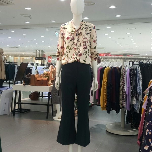 브이넥라인에 진주단추가 여성스러움을 더해주고 플라워패턴에 타이 블라우스입니다