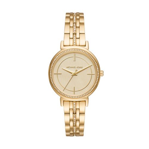-. Feature : Goldtone stainless steel / Water resistant to 5ATM / Pave set crystals / Quartz movement / Mineral glass