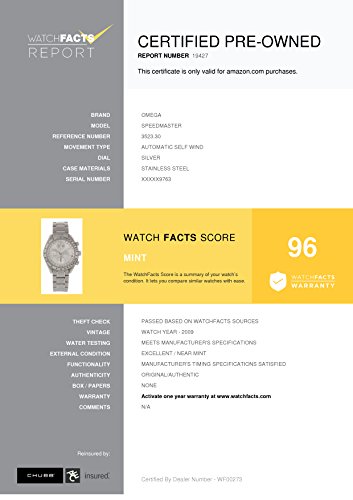 -. Feature : Omega Speedmaster 3523.30 with 7.5 inches band, stainless-steel bezel and silver dial / Authenticated by WatchFacts. Grade Rating: 96 / Condition: Mint / No papers offered with this watch / Automatic-self-wind movement / Watch year: 2009