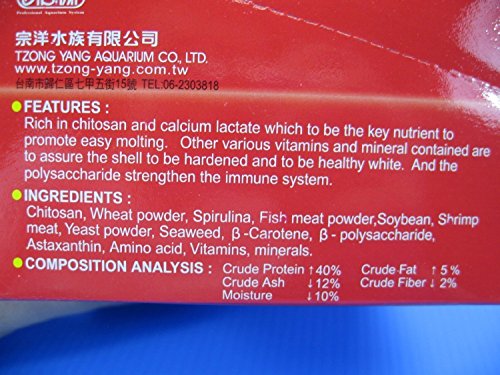 ●Rich in chitosan and calcium lactate which to be the key nutrient to promote easy molting. ●Other various vitamins and mineral contained are to assure the shell to be hardened and to be healthy white. ●And the polysaccharide strengthen the immune system.