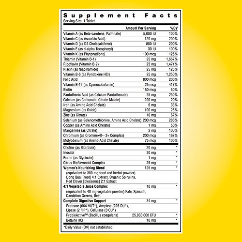 This best-selling natural FOOD-BASED multivitamin provides targeted support for women for a difference you can feel. Contains bonebuilding nutrients an energizing B-complex for stress management and heart health, iron and other research-backed nutrients and potencies. Now guaranteed AllergenSafeguard (free of gluten, soy, yeast, fish/shellfish, nuts, dairy) and with 90 million bioactive probiotics. Also free of artificial colors, flavors, sugar, sweeteners, preservatives, and other objectionable additives often found in vitamin products.Feature