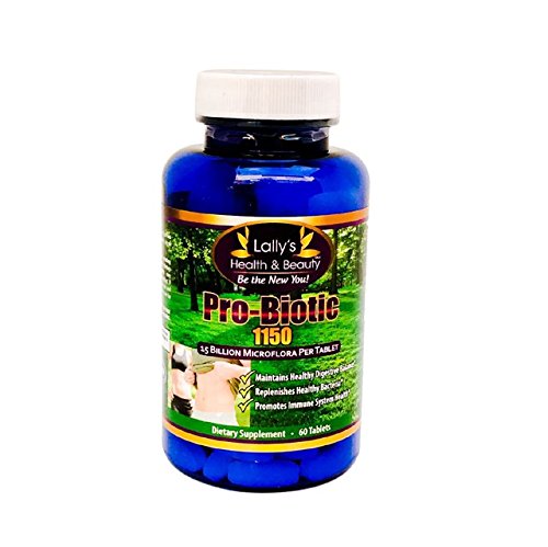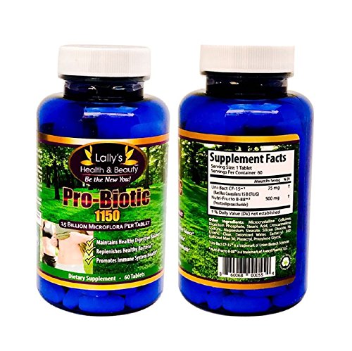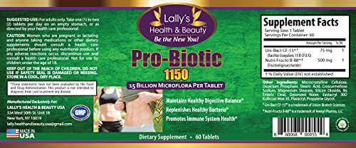 LALLY'S HEALTH AND BEAUTY PRO-BIOTIC 1150 is an advance PROBIOTIC FORMULA, contains 75mg of Unique IS-2 (Bacillus Coagulans 15 CFU/G) and 500mg of Nutra Fructo B88 (Fructooligosaccharide) per one tablet serving. Probiotics are good bacteria that are essential for many vital body functions. Probiotic 1150 formula promotes stomach health as the body needs beneficial bacteria for a variety of functions including healthy digestion. About the product HIGHEST NUMBER OF CFUS PER SERVING AND 2X MORE THAN SIMILAR PROBIOTIC SUPPLEMENTS for Better Digestive Health, Immunity and Bowel Regularity. 60 Tablets - 60 Day supply MADE IN THE USA IN A STRICT GMP AND FDA Certified lab. THE BEST QUALITY PROBIOTIC SUPPLEMENT that Supports More Vitamin Production And Aids in Daily Relief from common digestive issues. ALL NATURAL AND SAFE PROBIOTIC INGREDIENTS that helps to control appetite, bowel movements, and aids in the Digestive System. THE INDUSTRY LEADING REVOLUTIONARY FORMULA helps with production of good bacteria in the stomach. 100% Safe Natural USA made product with NO chemicals, preservatives, fillers or blenders. NO Need for Refrigeration.Feature