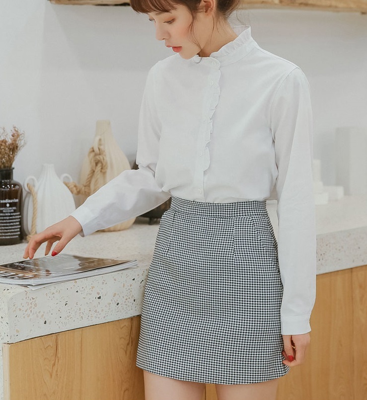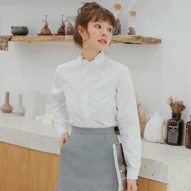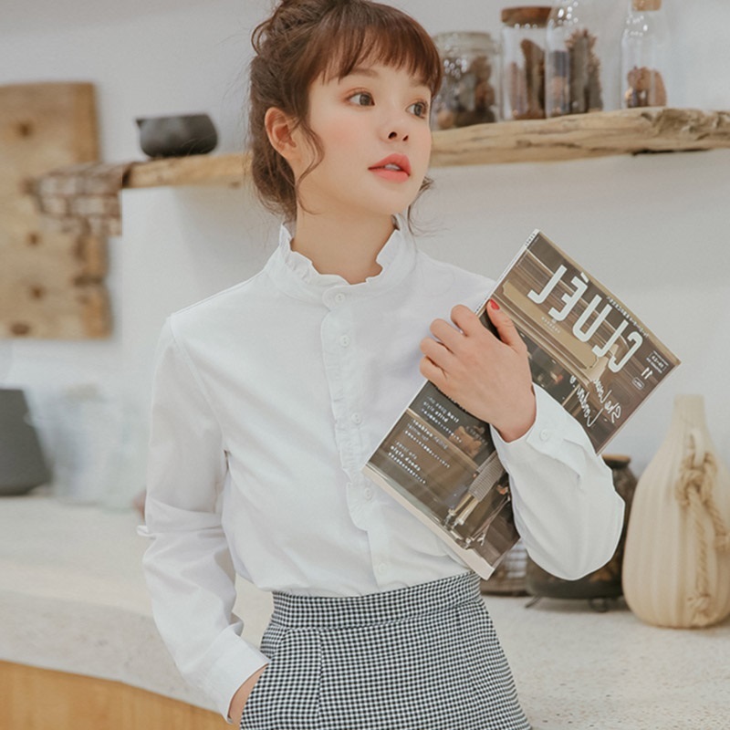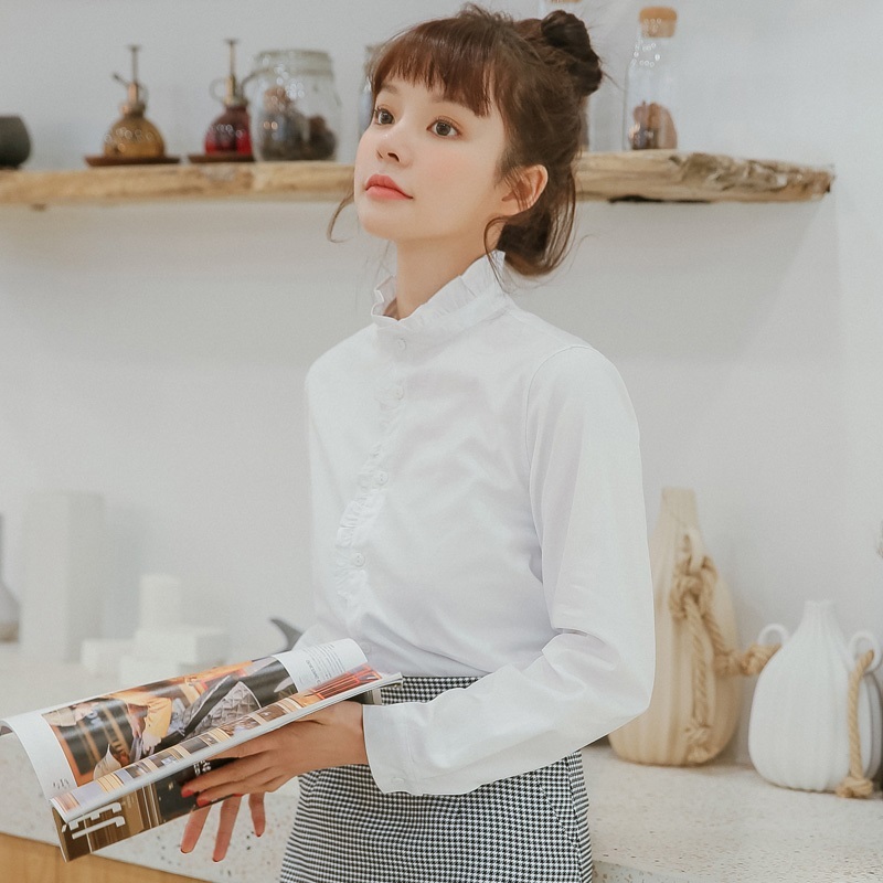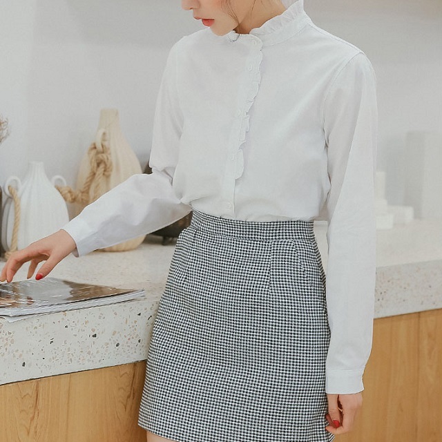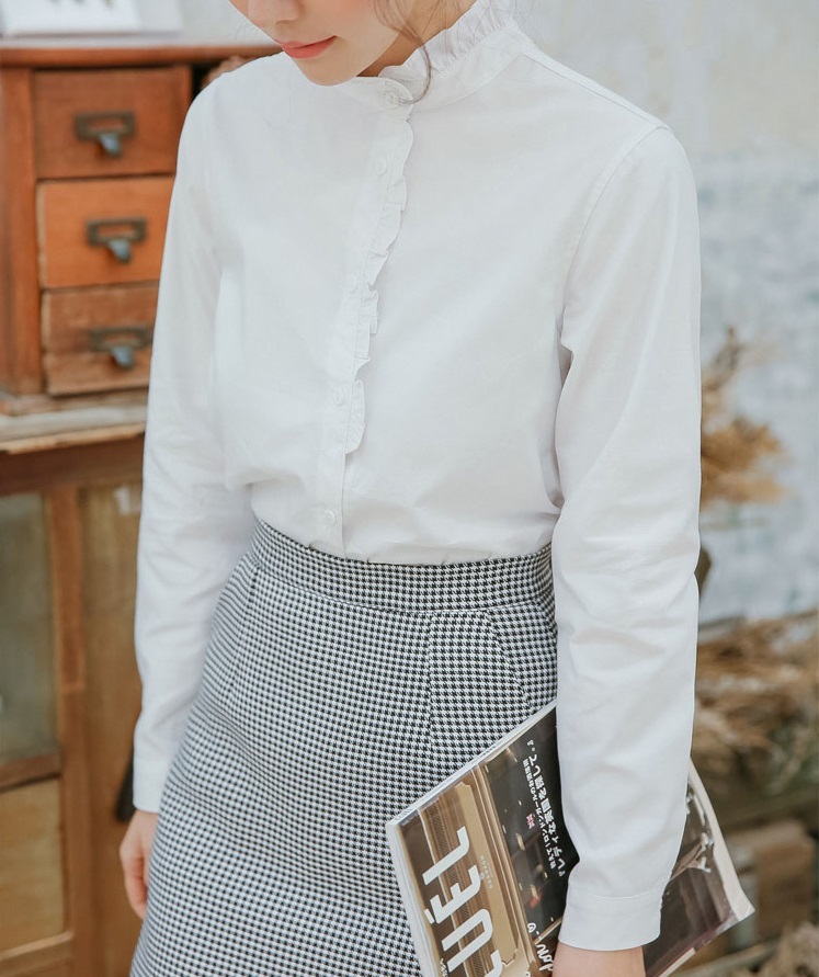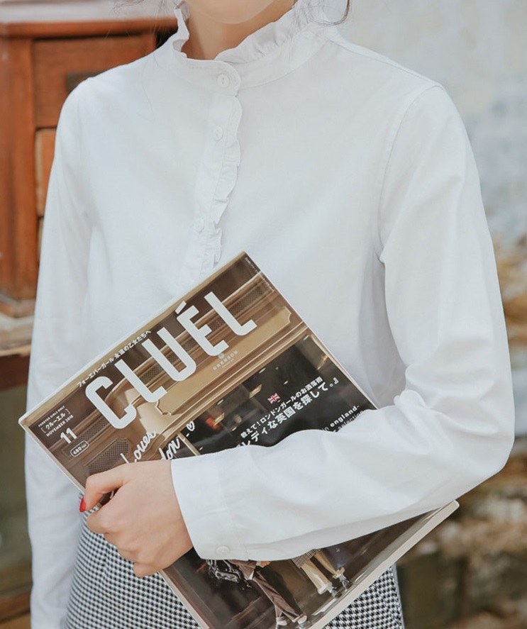 プチハイネックとボタンラインにあしらった控えめフリルがガーリーなポイント。