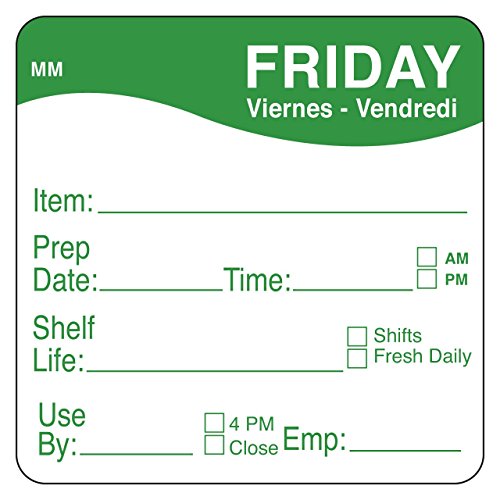 - The day of the week is printed in English, Spanish, and French for multilingual kitchens