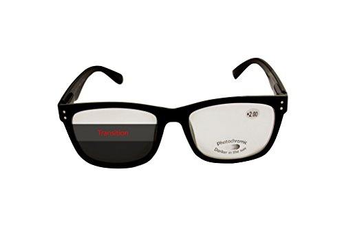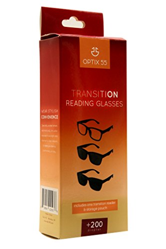 Product Description If you're like me, you don't want to have the added bulk of having to carry around a pair of sunglasses, if you already wear glasses. Instead of carrying the extra pair, we end up squinting against the glare and wishing we'd brought them with us. Luckily, there's a solution. These Transition Reading Glasses from Optix 55 change seamlessly from regular reading glasses to shades in a snap, and without the hassle of keeping two separate pairs of glasses. About This Product: ? Photochromic Transition Lenses ? Shiny Black Frames in a Classic Design ? Available in Multiple Prescription Strengths, 100 to 400 ? Converts Instantly When Exposed to Sunlight ? Perfect for Heavy Readers ? Improve Focus Concentration at School Work Whether you plan to spend your time reading, studying or working indoors or you're up for a day at the beach Optix 55 Transition Reading Glasses have got you covered. Our specially coated lenses automatically tint when exposed to sunlight revert to clear when you're back inside, making it easy to protect your eyes from harsh glare and UV rays without the need to carry around a dedicated pair of sunglasses. Our reading glasses give you the extra assistance you need to focus on small objects at a close distance, like words on a page or needlework. Keep a pair at home, work or anywhere else you may need them in a pinch. LONG LASTING PERFORMANCE AT AN AFFORDABLE PRICE These glasses are made from durable, high quality materials and spring hinged lenses that are resistant to wear and tear, so you can enjoy the convenience of our transition reading glasses for a long time. THE OPTIX 55 PROMISE At Optix 55, we take pride in providing superior products that make daily life easier and strive to guarantee our customers 100% satisfaction. Please don't hesitate to contact us if you need assistance in any way. 0