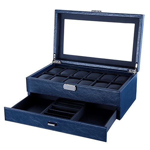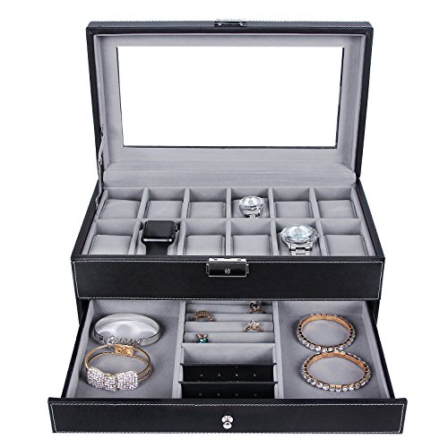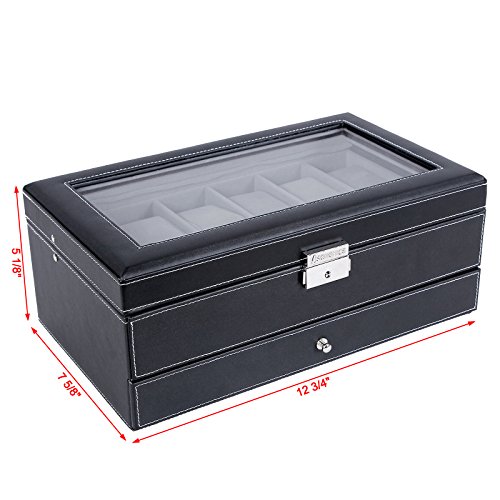 SONGMICS Black Leather Watch Box is great for personal use, shop display and home decoration. What a great way to not only display your jewelry but also save time in the morning. Real glass top provides you with better view to choose your beloved jewelry. The lid has a metal hinge attached to keep it from falling back. Metal lock with keys makes sure of safety. This is a nice showcase and works well to keep your watches, necklaces, bracelets, rings, earrings safe and organized. Nice gift idea for girls, boys, women and men. Specification:
