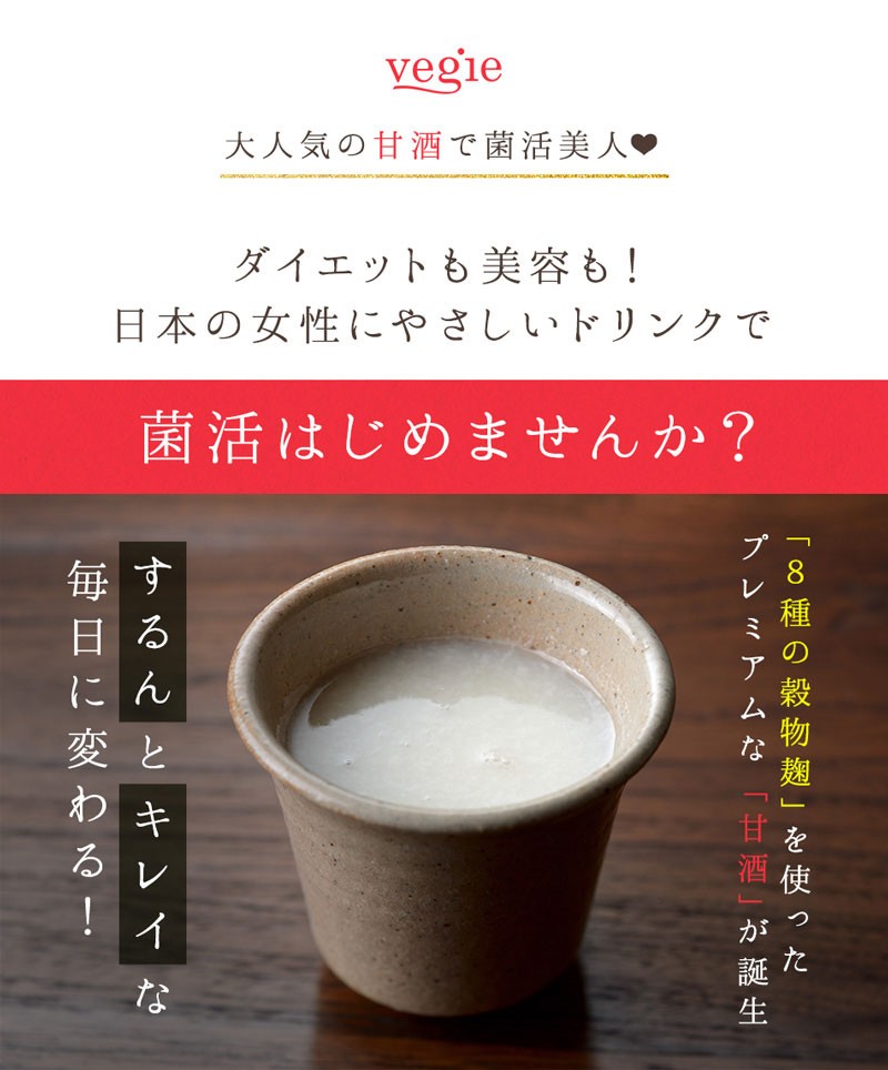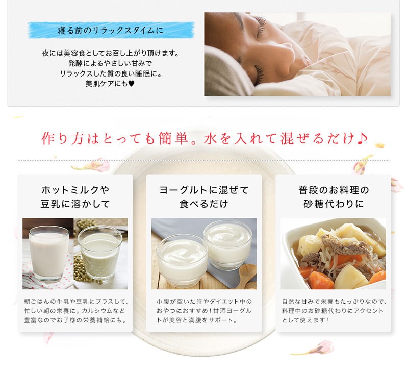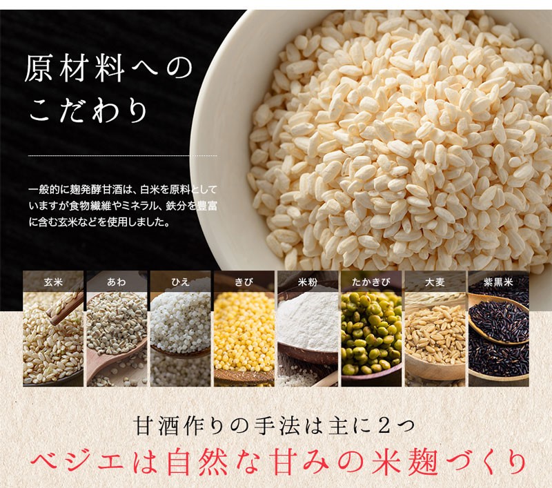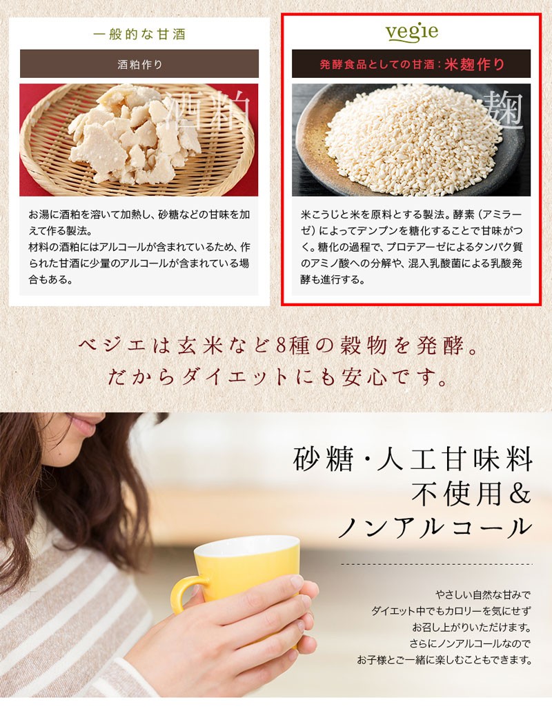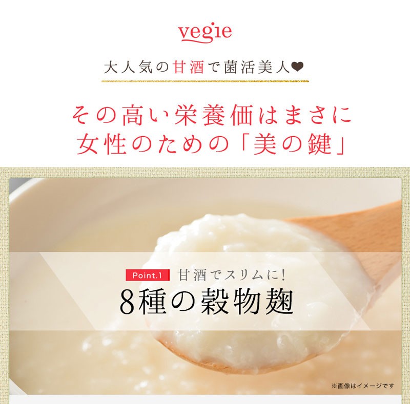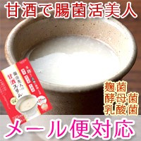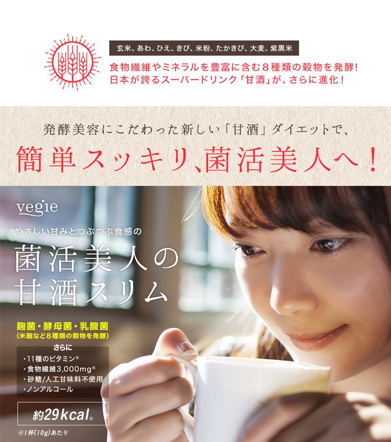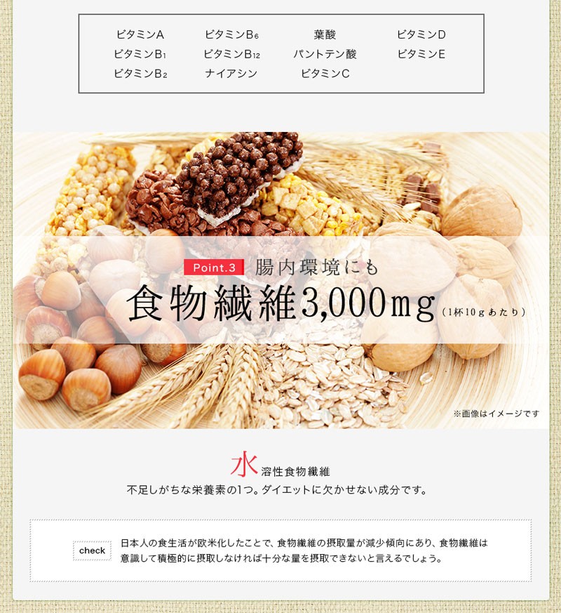 水溶性食物繊維、果糖、酒粕パウダー、玄米麹粉末、食塩、穀物麹、酵母、殺菌乳酸菌末、有胞子性乳酸菌、加工でんぷん、増粘剤(グアーガム)、甘味料(ステビア)、V.C、V.E、ナイアシン、パントテン酸Ca、V.B1、V.B6、V.B2、V.A、葉酸、V.D、V.B12、(原材料の一部に乳を含む) |