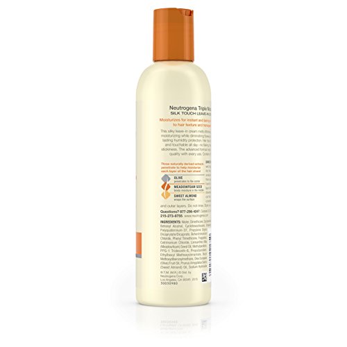 Get salon-quality results with Neutrogena Triple Moisture Leave-In Cream. Formulated for extra-dry hair, this gentle, deeply conditioning cream penetrates into each strand of hair, improving smoothness and manageability while diminishing flyaways and frizz. The cream spreads evenly to instantly help soften, smooth, and condition. Three naturally derived extracts penetrate and help moisturize each layer of the hair strand. Olive penetrates the center, meadowfoam seed helps moisturize the middle, and sweet almond wraps the surface. This formula also contains UV filters to protect the hair from the sun’s damaging rays.Feature