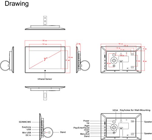 -. Binding : Electronics -. Brand : SSA -. EAN : 0602766175925 -. Feature : 7-Inch High Definition (800x480) LCD Screen / Choose between slide show and single photo display; rotate feature; file manager / SD/SDHC card slot and USB port to read various external devices,Calendar and clock functions / Really easy to use, with no required setup and no software to install - just turn it on. It's that easy. / Plays videos and music with built-in speakers and headpone output jack. -. Label : SSA -. LegalDisclaimer : 7inch Digital Photo Frames -. Manufacturer : SSA -. Model : ZN-DP7001 -. MPN : ZN-DP7001 -. PartNumber : ZN-DP7001 -. ProductGroup : CE -. ProductTypeName : DIGITAL_PICTURE_FRAME -. Publisher : SSA -. Studio : SSA -. Title : 7 Inch Digital Photo Frames 800x480 Digital High Resolution Digital Photo Frame With Auto On/Off Timer, MP3 and Video Player Advertising Player With VESA (Black)SSA -. UPC : 602766175925
