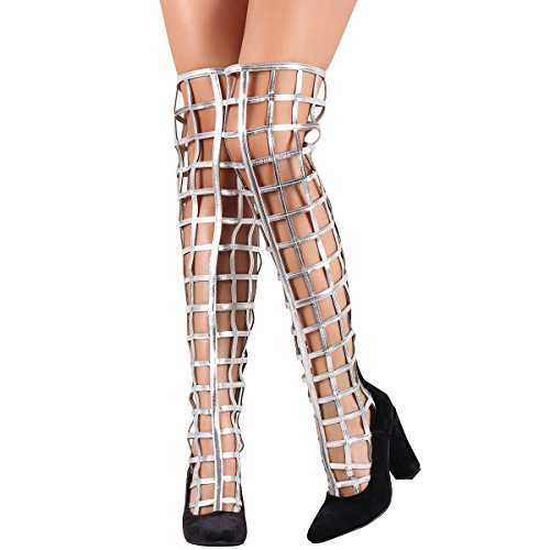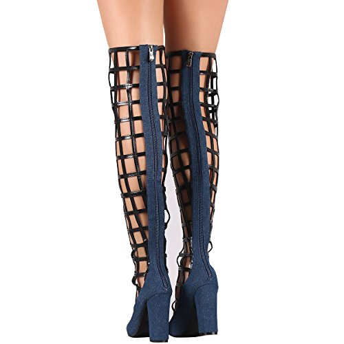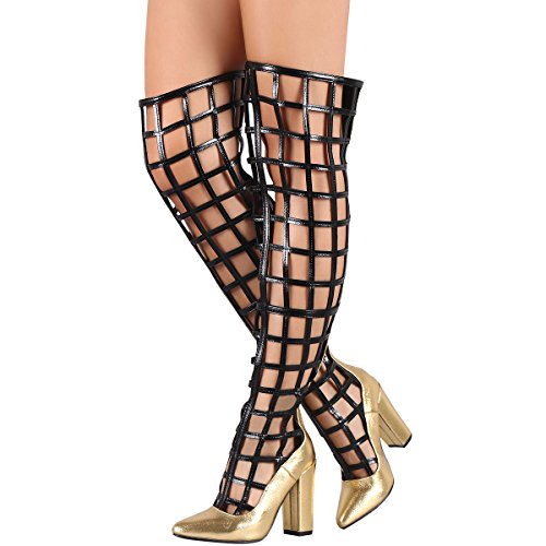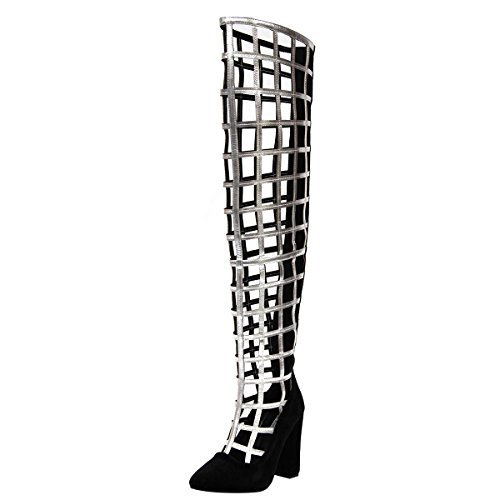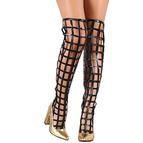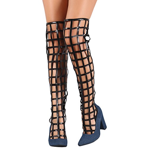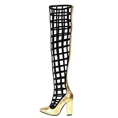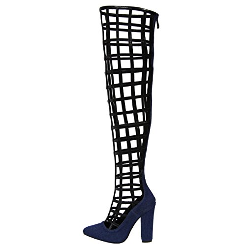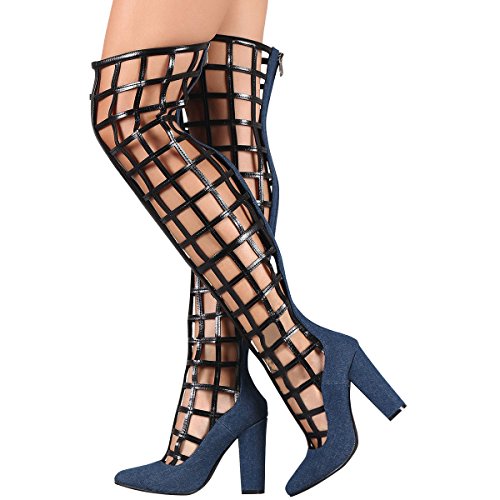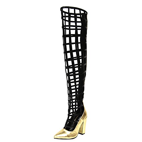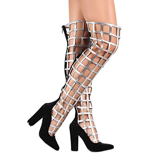 Cape Robbin Womens Pointy Toe Over The Knee Cage Cutout High Heel Gladiator Chunky Heel Boot
