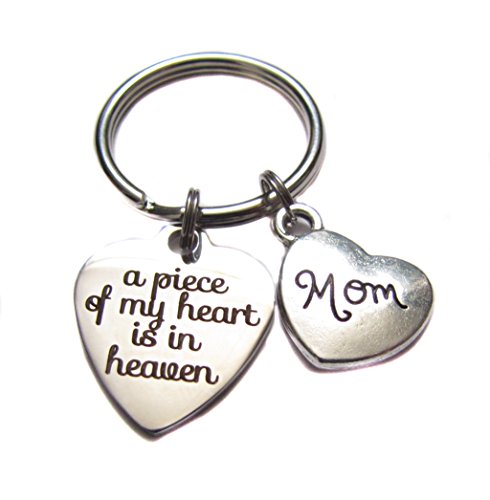Studio : Heart Projects Publisher : Heart Projects Binding : Jewelry Product Description Keychain, made with a 3/4" x 7/8" or 19mm x 22mm stainless steel "A Piece Of My Heart Is In Heaven" heart charm and an antique silver "Mom" heart charm. Can be used as a keychain, bag charm, zipper pull, etc. 0