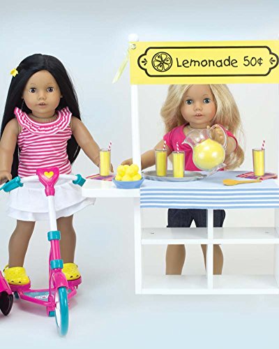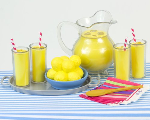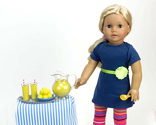 -. Feature : Delightful, life like, high quality 9 pc. lemonade set for 18 inch dolls, stored in lemonade stand box / Your doll (or Teddy Bear) can pretend to pour the pitcher of lemonade for her doll friends with 4 tall glasses of lemonade, ice cubes and straws! / Complete with paper napkins & a blue striped tablecloth / Perfectly scaled lemonade food serving set for your favorite American Girl, Gotz, Madame Alexander & Sophia's Dolls! / Made by Sophia's, Leading Doll Clothes & Doll Shoe & Accessory Maker. / In addition to this 9 piece set are 4 paper napkins