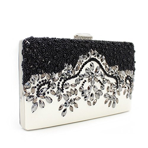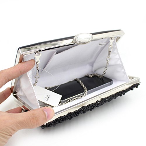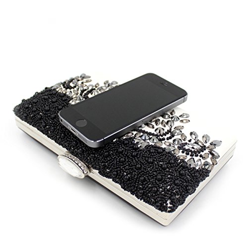 -. Feature : Material:electroplated chain/closure+ artificial pearls + rhinestones / Dimensions:11.4" L x4.7" H. Large storage for your iPhone 6s or less, lipstick, cash, credit cards, small makeup and other small items / Product usage: Multipurpose, party, wedding, school, casual dinner, date, etc. / This black & white clutch is very unique and something you get when you think out of the box. Very classy and elegant. / The front of bag is covered in white PU leather and the beads and stones are all sewed into the clutch. The hooks are easy to take out and clasp the chain onto to use it as hand bag or shoulder bag (a small and long chain came with the clutch).