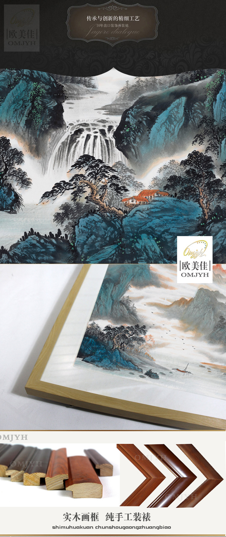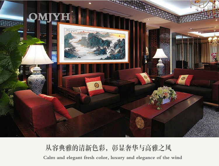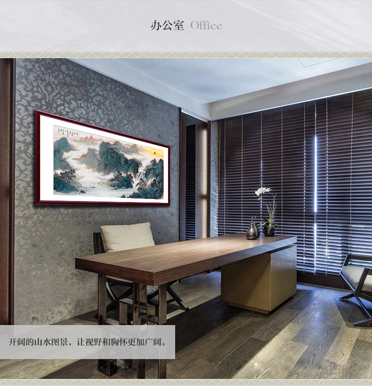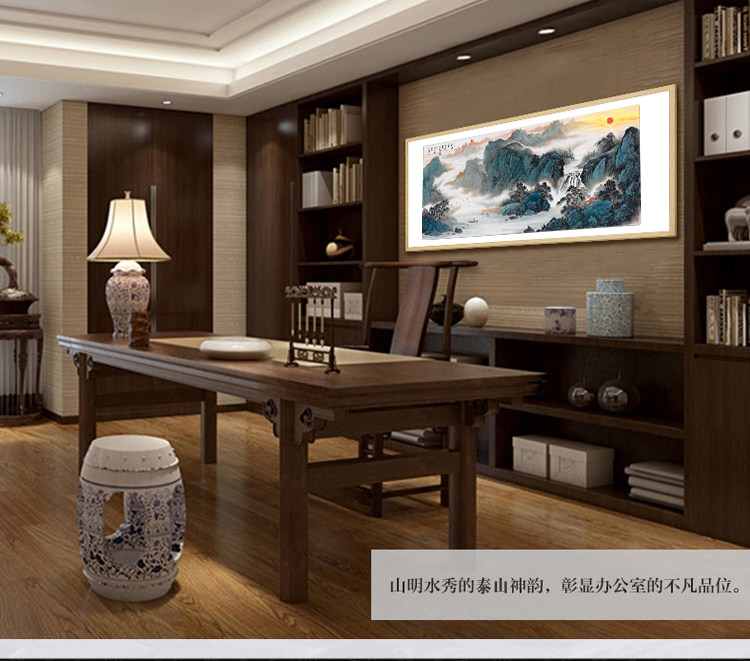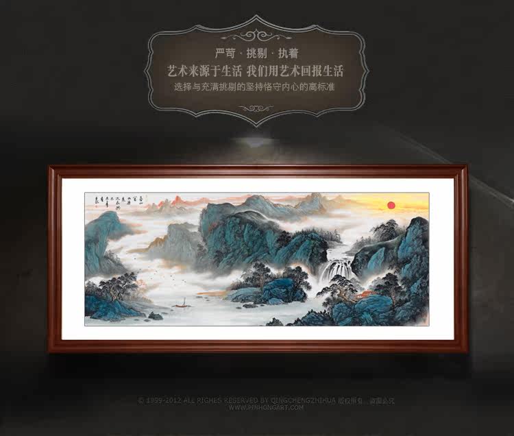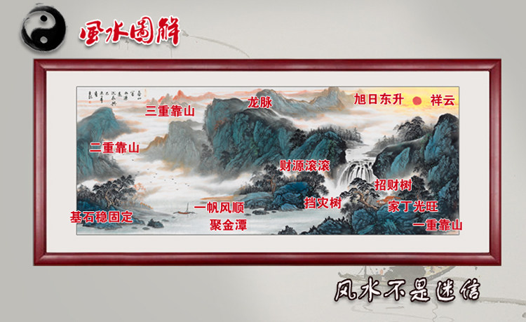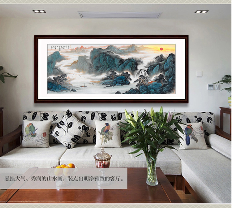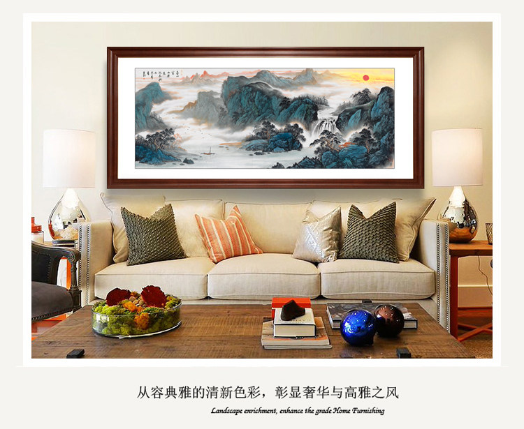国画旭日东升聚宝盆 客厅办公室青绿山水画有框风水挂画字画书画