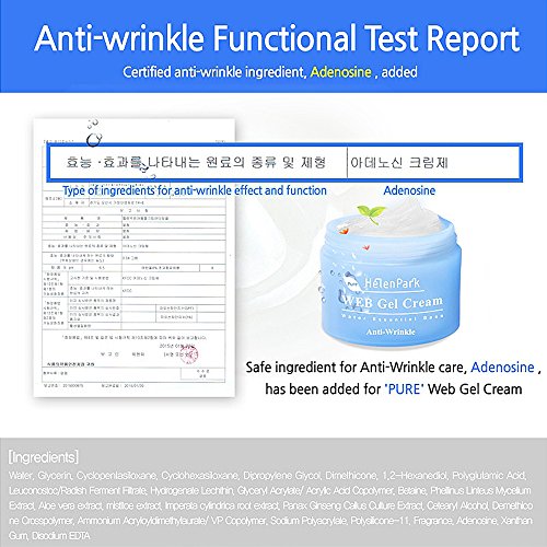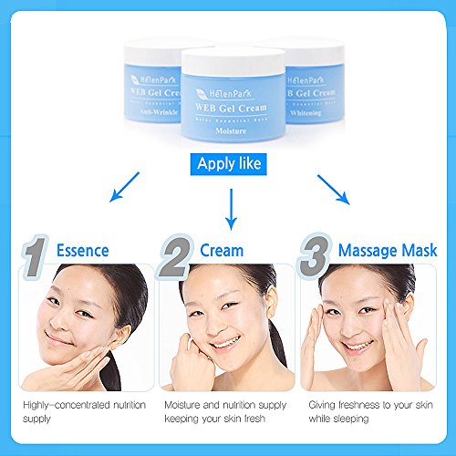 -. Binding : Misc. -. Brand : Helen Park Cosmetic -. EAN : 8809205629670 -. Feature : WEB Gel Cream 3 in 1 (Essence, Cream, Pack) / Helen recommend for Those who need moisture and nutrients in spring, summer and early fall. Those who want light texture without stickiness. Those who prefer product with less oil. Those who want functional care for the skin that lost brightness and elasticity. / Anti-wrinkle Care WEB Gel Cream 100ml Anti-wrinkle Care Strong moisture recharging Fresh finish Clear coolness Help whitening skin by Adenosine, the functional material certified by KFDA. / Improve skin condition Moistness without stickiness Keep moisture for a long time Adhesive power that helps make-up Finish up with velvet-like skin Increase skin elasticity as it provides moisture and nutrients -. Label : Made in Korea -. Manufacturer : Made in Korea -. NumberOfItems : 1 -. PackageQuantity : 1 -. ProductGroup : Beauty -. ProductTypeName : BEAUTY -. Publisher : Made in Korea -. Studio : Made in Korea -. Title : HelenPark Anti-wrinkle Care WEB Gel Cream 100ml