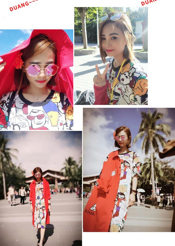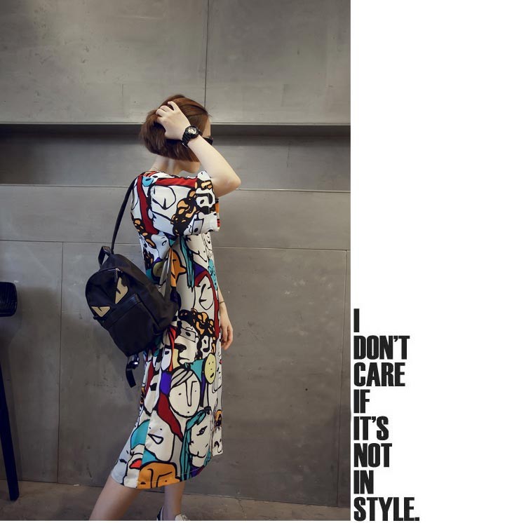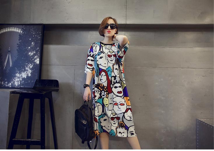 個性的なアニメフェイスプリントのラウンドネック・ひざ丈ワンピース♪