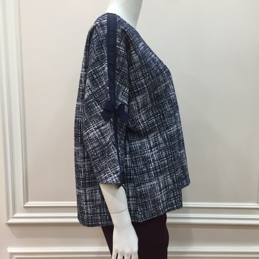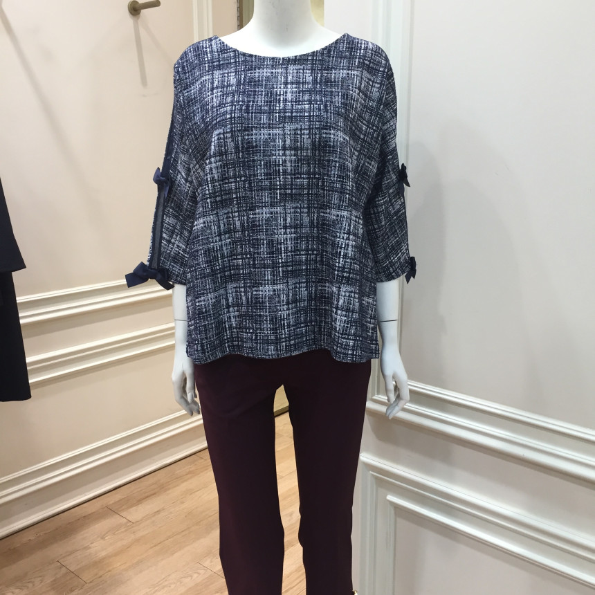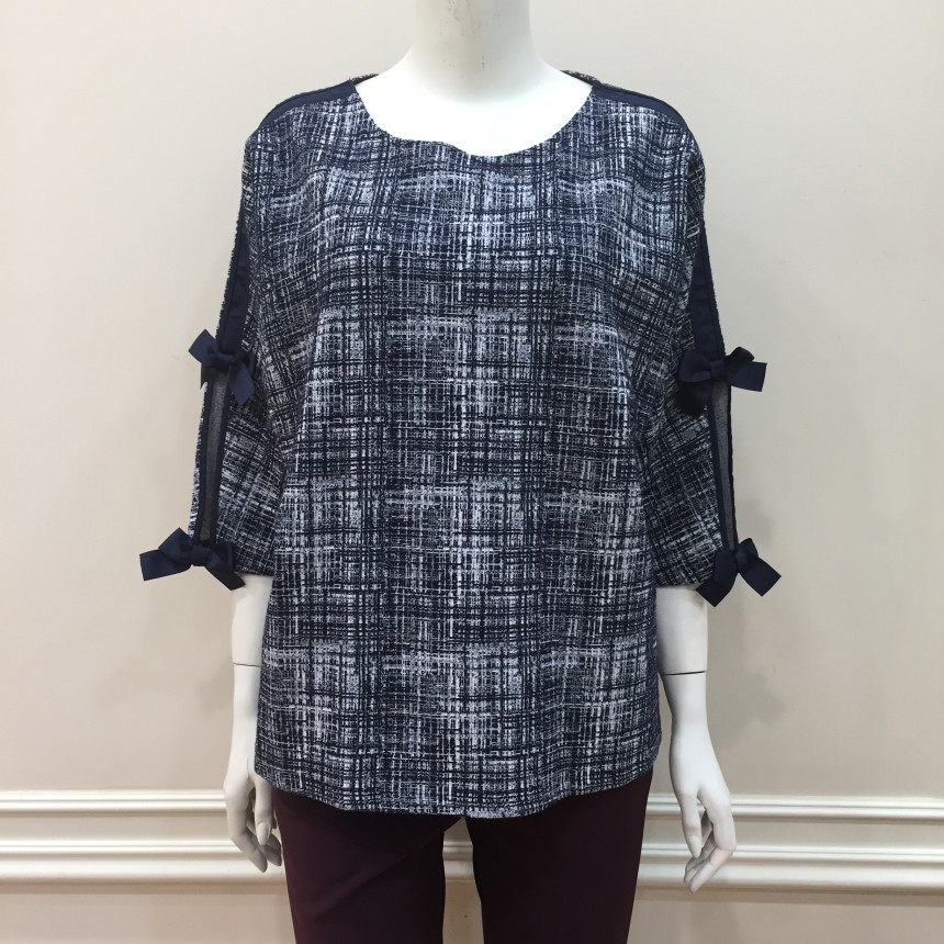 여름 트위드소재의 블라우스용 탑입니다.루즈핏 디자인으로 팬츠와 잘 어울립니다. 팔부분의 리본장식으로 귀여움을 더 하였습니다.54사이즈가 슬림66입으시는 분이 입으셔도 될만큼 넉넉한 디자인이므로 사이즈 고르실때 참고부탁드립니다.54(55)사이즈 기준 가슴 반품 60CM입니다.