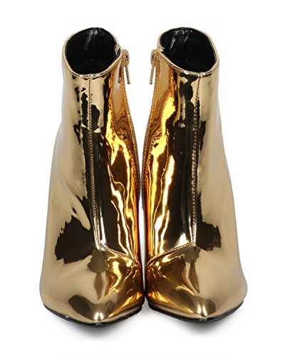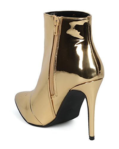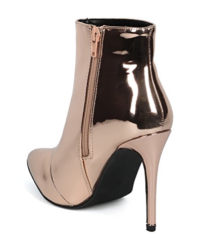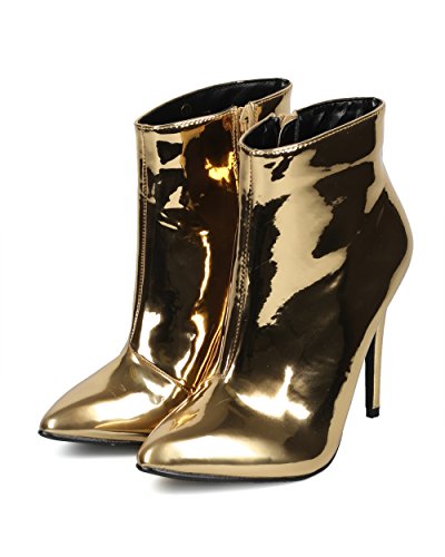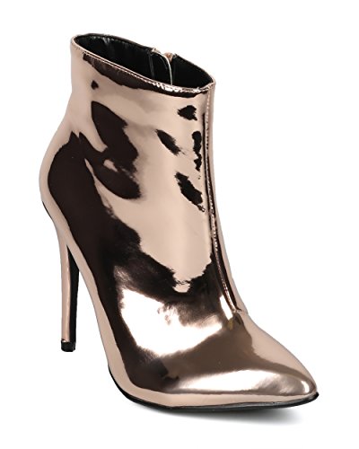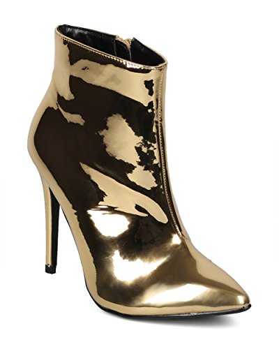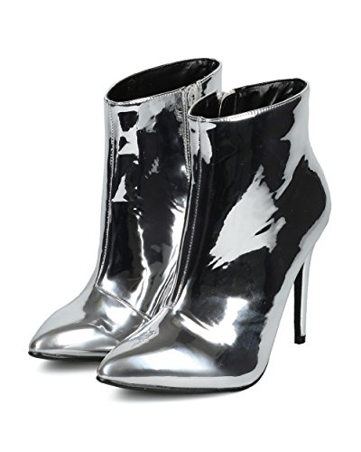 Product Description These sleek booties are made with a mirror metallic leatherette upper, pointy toe and stitch details. Also made with a single sole, stiletto heel and finished with a side zip for easy slip on and off. 0
