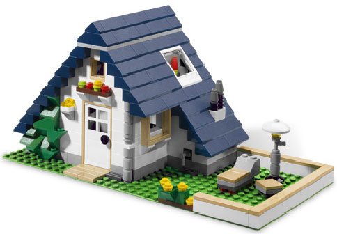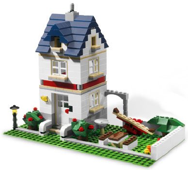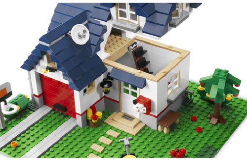 -. Feature : 3 models in 1: Rebuild into a tall townhouse or summer home / Classic family house packed with details, like mail box, lawnmower, outdoor light, water tap in the garden and much more / Features a blue tiled roof which can be lifted to play inside / Highly detailed: Basketball hoop, TV antenna and garage / 539 pieces