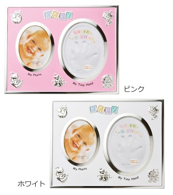 写真と手形を一緒に残せる記念のフレームです。 製造国:中国 素材・材質:スチール、シルバーメッキ、ペイント、ABS 商品サイズ:288×228mm 仕様:内寸:94×204mm、119×204mm窓寸:78×106mm、106×140mmマット窓寸:93×123mm写真サイズ:L判縦置き専用裏面/カラー:グレー、素材:ABS・ベルベット ※サプライヤー直送品 ご注文後3~4営業日後の出荷となります【商品名】ラドンナ ベビーフォトフレーム 記念フレーム 手形粘土付 288×228 ピンク・MB21-20-PK