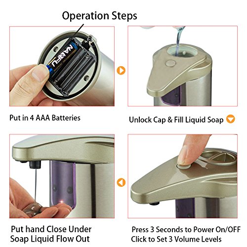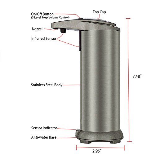 It is often used in a kitchen or washroom to dispense dishwashing detergent, hand santinizer, shampoo or other liquid soap. This product has 3 different volume settings by a click at the on/off button to adjust the amount of soap to pump out at one time. Capacity of the soap dispenser is about 280ml.