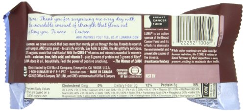 -. Binding : Health and Beauty -. Brand : Clif Bar -. IsAdultProduct : 0 -. Label : Clif Bar -. Manufacturer : Clif Bar -. NumberOfItems : 1 -. PackageQuantity : 1 -. ProductGroup : Health and Beauty -. ProductTypeName : HEALTH_PERSONAL_CARE -. Publisher : Clif Bar -. Studio : Clif Bar -. Title : Luna Bars, 1.69-Ounce Bars