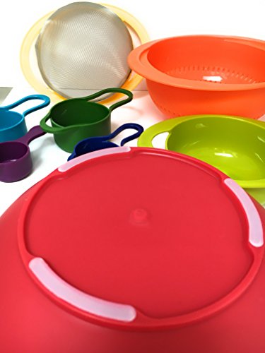 Studio : Dalea Home Products Publisher : Dalea Home Products Product Description 8 Piece Set: Introducing the ingenious multi-purpose mixing bowl nesting set from Sterling Chef. When you're short on storage space and need high quality kitchen essentials at your fingertips, our 8 piece set is ideal. Each set includes 8 essentials including bowls, measuring cups, a stainless sieve and a colander, all nested together in a rainbow of colors. High Quality Durable: The high quality, durable plastic is non-toxic BPA-free and food-grade. When you're short on storage space, this set all fits together in one compact stack, taking up minimal room in your kitchen cabinet. Every piece in this space-saving set is high quality with smart features like wide handles, non-slip bases on the bowls, measurements highlighted on the inside of the small bowl, and a durable stainless steel sieve instead of inexpensive nylon. The ellipses shape means pouring from any one of the bowls and utensils will be spill free. Kitchen Essentials: This set is ideal for measuring all dry or liquid ingredients. The measuring cups include 1 cup, ½ cup, 1/3 cup and ¼ cup. This convenient set is the one you'll be reaching for time after time. The entire set includes: ? 4 1/2-liter mixing bowl ? 0.5-liter mixing bowl ? 3-liter colander ? 1.65-liter sieve ? 1 cup measuring cup ? 1/2 cup measuring cup ? 1/3 cup measuring cup ? 1/4 cup measuring cup Perfect Gift: The 8 piece set comes packaged in a beautiful, colorful box ready for you to enjoy at home or send as a gift. The set is ideal for birthdays, showers, weddings, mothers' day, fathers' day and more! Great for kids and young bakers too. Sterling Chef: Part of the Dalea Home Products family, Sterling Chef is a name you can trust in housewares and fine quality kitchen products. Dishwasher safe. Do not use in the microwave. Hand wash sieve. 0