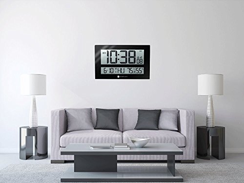 -. Feature : The oversized self setting time clock features jumbo 4.25 inch tall digits and clean, high contrast LCD display for easy viewing. / The clock automatically sets the time and date to your selected time zone (four US time zones) with manual override. / The time is adjustable for 12 hr standard time or 24 hr military time. / The clock is ideal for your office, conference room, study, or any large room where accurate time, temperature and humidity are needed. / The display includes temperature (°F or °C), humidity, perpetual calendar with date and day of week, radio controlled time, DST and low battery indicator.