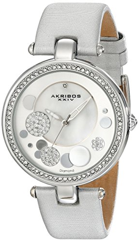 ReleaseDate : 2012-02-15 Studio : Akribos XXIV Publisher : Akribos XXIV Binding : Watch Amazon.com The Akribos XXIV Women's AKR434SL Silver-tone/Sunray Diamond Dial Quartz Strap Watch is a lovely timepiece for a lovely lady. Featuring a silver analog dial with mother-of-pearl center, diamonds on the dial, crystals on the bezel and a silver calfskin band, this watch is a stylish complement to your wardrobe. 0