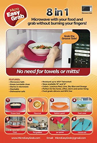 Studio : Micro Easy Grab Publisher : Micro Easy Grab Binding : Kitchen Product Description As seen on Shark Tank and The Steve Harvey Show, the Safe Grab performs the tasks of multiple kitchen accessories. This hardworking 8-in-1 multitasker is a helpful addition to microwave accessories to reduce mess and minimize time spent cleaning a microwave. It's a food cover or splatter guard for containing messes before they happen, a silicone mat for catching bubbled-over spills, a spoon rest for messy utensils, a pot holder for safely grasp hot pan handles, a hot pad for removing hot dishes from the oven or microwave without burning hands, a trivet for under casseroles to protect surfaces from heat and scratches, a non-skid placemat and jar opener that adds that extra leverage when opening the pickle jar. Even use under the dog dish or cat bowl to confine mealtime messes. It's flexible for easy handling. Ridges on the underside keep hands safely away from heat. Made from food-safe, BPA-free non-stick silicone, it's durable and naturally non stick to stand up to even the stickiest of foods. Temperature safe to 450-degrees Fahrenheit. Won't scratch surfaces. Wipes clean with a damp sponge and is dishwasher safe for a thorough cleaning. 0