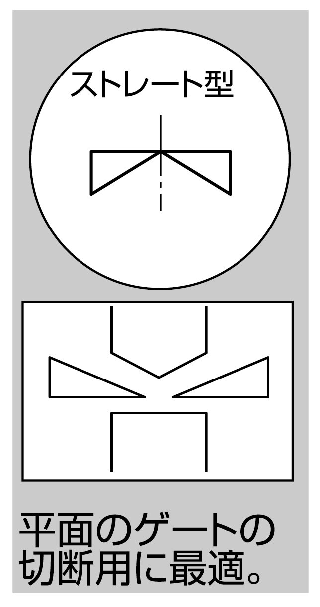 Production · Cutting gate of general plastic molded parts ● Hardness: 52 to 57 HRC (blade part) ● Weight: 95 g ● Total length: 166 mm ● Width: 48 mm ● Warning: Molding grips are not insulators.
