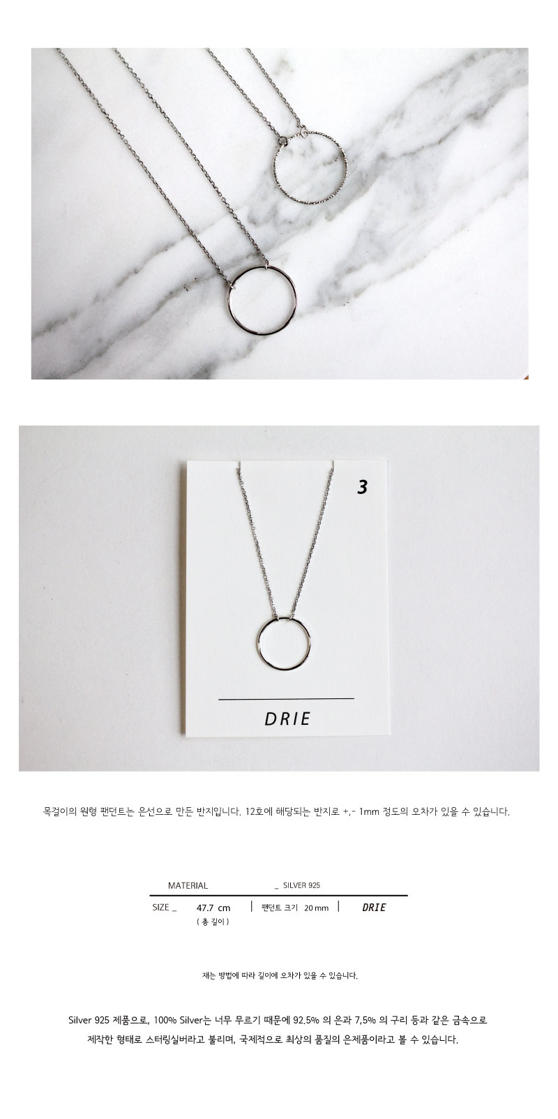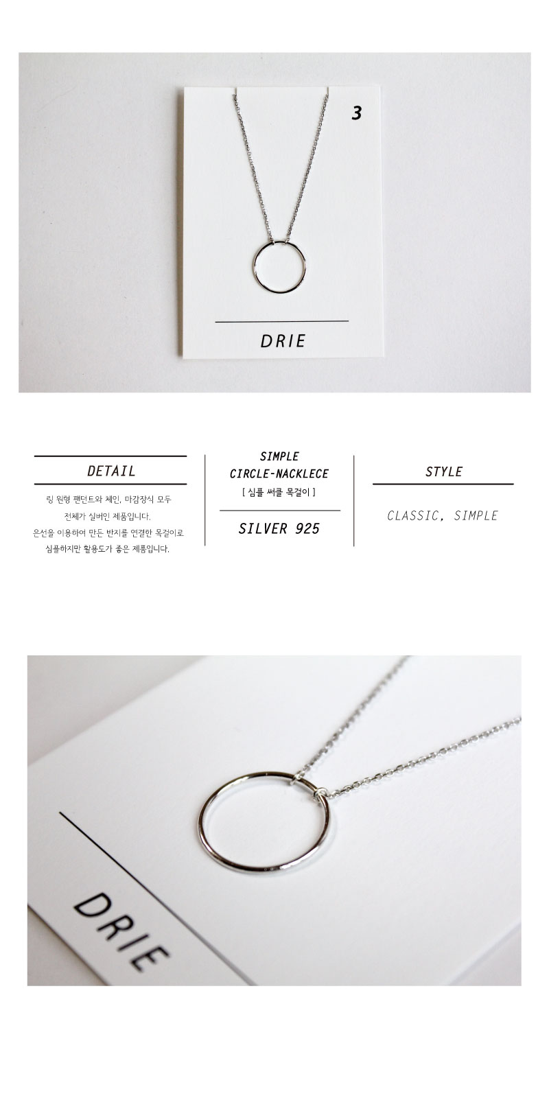 링 원형 팬던트와 체인, 마감장식 모두 Silver 925 로 이루어진 제품으로, 심플하지만 활용도가 좋은 제품입니다.