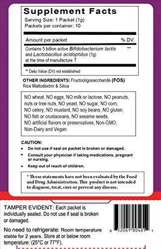 -. Feature : Non-Dairy, Gluten and Sugar Free / Can Naturally Help Reduce diarrhea and stomach upset caused by antibiotics / Made in the U.S.A / Free of Food Allergens including Soy, Peanuts, and Tree Nuts / No Refrigeration Required & Travel Friendly