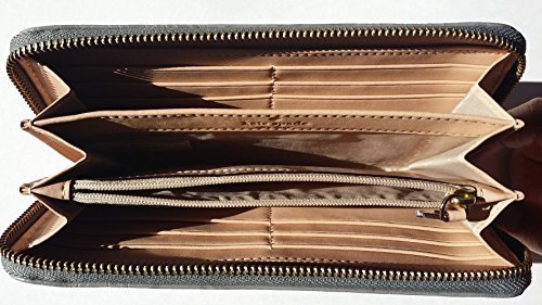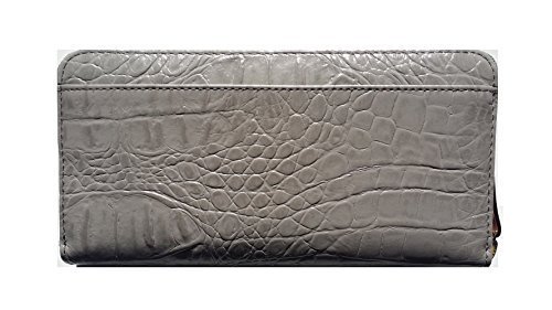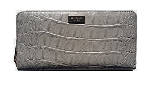 Wrapped in Cliffgrey textured leather embossed in a crocodile pattern with light gold plated hardware. This Kate Spade zip around wallet is accented with the Kate Spade logo staple on the front and features a full length lined slip pocket on the back. The interior is leather and Kate Spade logo printed fabric. The interior has a center zippered coin compartment, 12 card slots and full length bill compartments. The overall measurements are approximately 7.75" (L) x 4" (H) x 1" (W).Feature