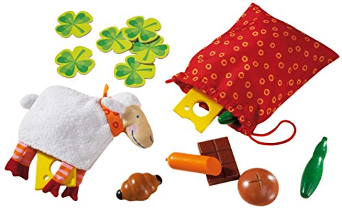Includes: soft fabric sheep (with opening to hide objects inside), 12 wooden food pieces that are safe for children to put in their mouths, one drawstring bag and 6 shamrock award tokens.