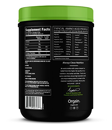 Orgain Collagen Peptides are sourced from grass fed, pasture raised and finished cows to ensure the cleanest, highest quality protein. Our Collagen Peptides are naturally free of gluten, sugar, soy, eggs, fish, shellfish, tree nuts, peanuts, wheat, preservatives and additives. Orgain Collagen Peptides supports joint function, strong hair & nails, muscle recovery, and radiant skin. Orgain Collagen Peptides are more versatile than collagen pills and can be mixed in anything from water, coffee, smoothie mix, or foods.Feature