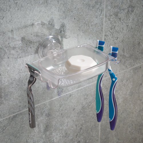 - Feature : Suction soap dish for shower or sink / Made of durable plastic / Power Lock system securely adheres to smooth surfaces / Includes razor and toothbrush holders / Clear finish