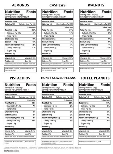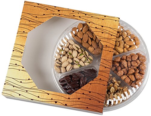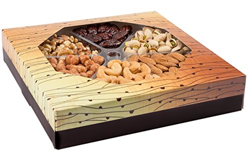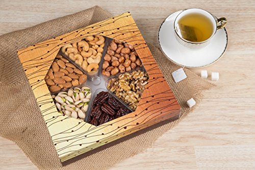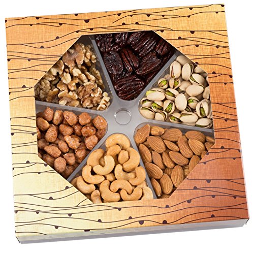 - A SCRUMPTIOUS 6-SECTION BOX OF FRESH ROASTED NUTS: Turn 'ho-hum' into 'totally yum' with this gift box of delicious, healthy nuts! Hand selected for superb quality and top-notch taste, this delectable variety of nuts will impress the most discriminating recipient. Dig into a gourmet array of Roasted Salted Almonds, Cashews, Pistachios, Honey Roasted Peanuts, Honey Glazed Pecans and Raw Walnuts.