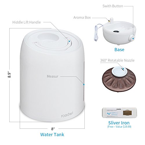 Roadwi Ultrasonic Cool Mist Humidifier, 5L/1.32G Large Capacity Oil Diffuser for Office Home Bedroom Living Room Study Yoga Spa (FREE Silver Ion Water Purifier)