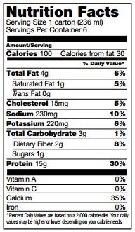 -. Feature : High protein. low calorie / Ingredients: Filtered water, protein blend (milk protein concentrate, whey protein concentrate, calcium caseinate), sunflower oil, microcrystalline cellulose, sodium carboxymethylcellulose, inulin, artificial flavor, sodium phosphate, DATEM (diacetyl tartaric acid esters of mono- and diglycerides), potassium phosphate, salt, carrageenan, colors (annatto, turmeric), sucralose and acesulfame-K (non nutritive sweeteners). May contain soy, eggs and wheat.