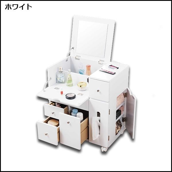 | 天板を開くと大きなミラーが!!細かいコスメから、背の高いボトル類まできちんと整理出来ます。移動に便利なキャスター付きなので、お好きな場所でメイクアップが可能です。 |