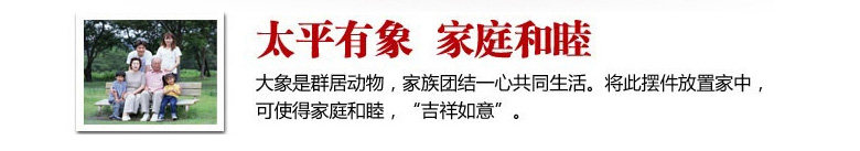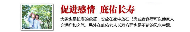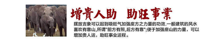 象谐"祥"之音,传统习俗中,象代表了吉祥。"象"能给人间带来祥瑞,象微天下太平。"象"即表示和平、美好和幸福。大象善于吸水,水为财,凡家居窗户见水,摆放"吉象运财"则能达到汲水纳财之功。