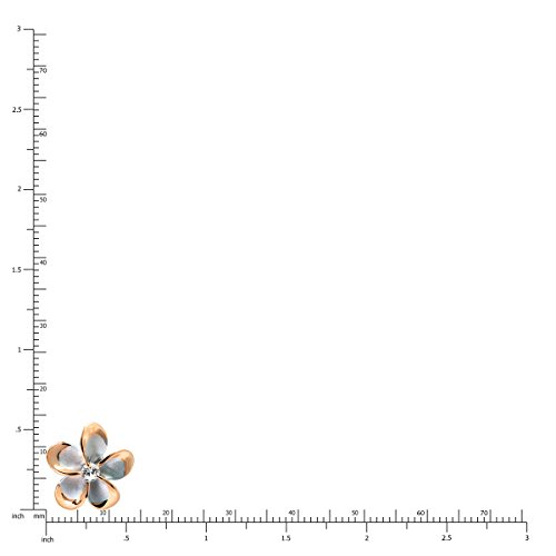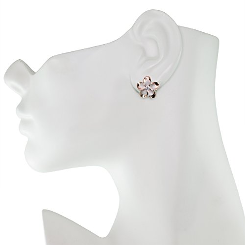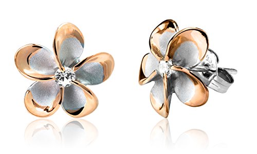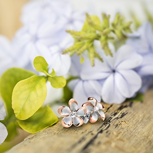 A pair of two-tone plumeria stud earrings, each with a twinkling CZ stone center. Flowers are 14mm wide (about 9/16 of an inch.) Made from sterling silver with a 14K rose gold finish. Gift box included. From Honolulu Jewelry Company, Honolulu, Hawaii.Feature