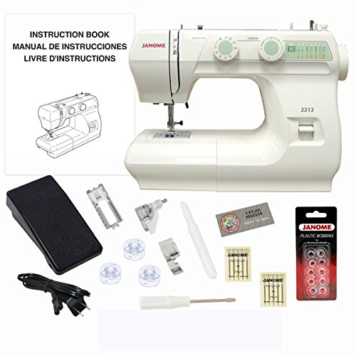 The Janome 2212 sewing machine features 12 built-in stitches, an easy to use four-step buttonhole, dial pattern selection, and zig-zag stitch width adjustment and stitch length adjustment that ensures ease of use.