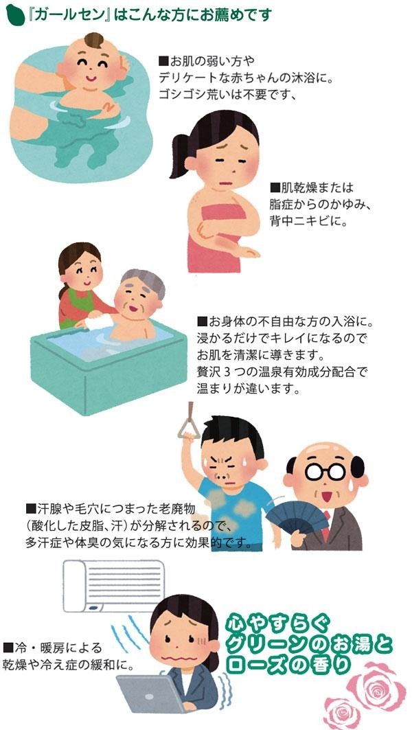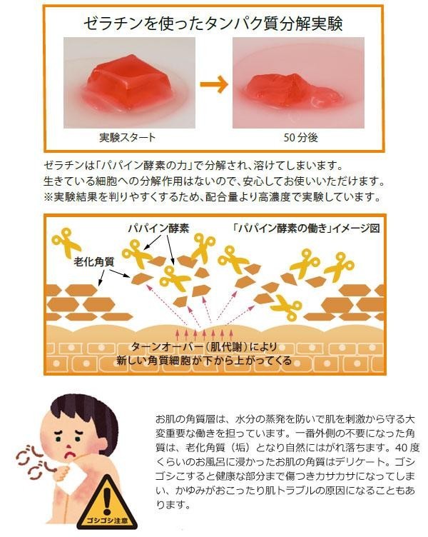 | 角質洗浄成分パパイン酵素配合で、入浴時にやさしくなでるだけでお肌はすべすべ。お湯につかるだけでお肌を清潔に導きます。 |
